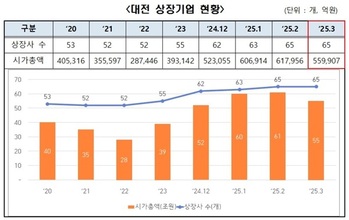 대전테크노파크는 3월 들어 코스닥이 급격히 무너지면서 대전 지역 상장기업들의 시가총액도 크게 줄어든 것으로 나타났다고 밝혔다.7일 대전TP에 따르면 3월 말 기준 대전 지역 상장기업의 시가총액은 55조9907억 원으로, 전월보다 5조8094억 원(9.4%) 감소했다.하