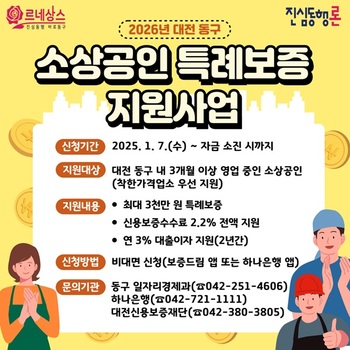 박희조 대전 동구청장이 고금리·경기 침체로 어려움을 겪는 지역 소상공인을 위해 최대 48억 원 규모의 ‘2026년 소상공인 특례보증 지원사업(진심동행론)’을 본격 시행한다고 밝혔다.6일 대전 동구는 동구청과 하나은행이 각각 2억 원씩 총 4억 원을 출연하고, 대전신용보