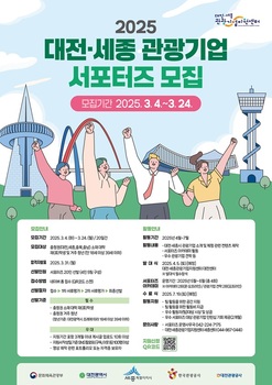 대전관광공사는 오는 24일까지 대전·세종 지역 관광기업과 충청권 청년들을 연결하는 ‘2025 대전·세종 관광기업 서포터즈’ 20명을 모집한다고 밝혔다.이번 모집은 관광 인력 양성과 지역관광기업 홍보를 위한 마케팅 지원을 위해 마련됐다.신청은 충청권(대전, 세종, 충남,