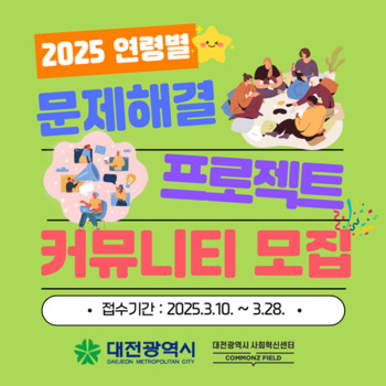 대전 사회 혁신센터는 오는 28일까지 ‘2025 연령별 문제해결 프로젝트’에 참여할 20팀을 선발 모집해 팀별로 150만 원에서 350만 원의 활동비를 지원한다고 밝혔다.이번 프로젝트는 시민 주도 문화 확산과 다양한 연령층의 목소리를 정책에 반영될 수 있는 환경 조성을