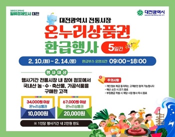 설 명절을 앞두고 대전 전통시장에서 장을 보면 최대 2만 원의 온누리상품권을 돌려받을 수 있다.또 대전시가 정부와 함께 전통시장 소비 활성화에 나선다.5일 대전시는 오는 10~14일까지 설 연휴를 맞아 농림축산식품부, 해양수산부와 함께 ‘전통시장 온누리상품권 환급행사’