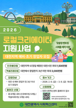 대전 사회 혁신센터가 예비 창업자부터 창업 3년 미만 초기 창업자까지 단계별로 육성하는 ‘2026 로컬크리에이터 지원사업’ 참여팀을 모집한다.5일 대전 사회 혁신센터는 오는 6일부터 내달 6일까지 대전 지역 창업가 발굴과 성장 지원을 위해 사업 참여팀을 모집한다고 밝혔