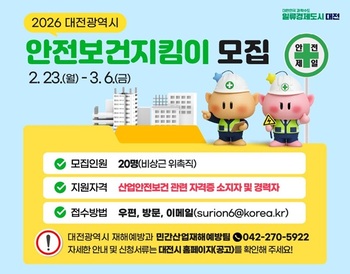 산업재해에 취약한 소규모 건설현장을 겨냥한 대전시의 현장 안전관리 정책이 본격 가동된다. 대전시는 민간 건설현장의 위험요인을 사전에 차단하기 위해 2026년 안전보건지킴이 20명을 모집한다.9일 대전시는 오는 23일~내달 6일 오후 6시까지 산업재해 예방과 안