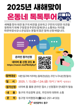 대전 동구는 오는 31일까지 구민들의 목소리를 듣기 위해 ‘2025년 새해맞이 온 동네 톡톡 투어’ 참여자를 모집한다고 16일 밝혔다.이번 모집은 박희조 구청장이 1월 13일부터 23일까지 16회에 걸쳐 각 동을 찾아 구민들과 소통하고, 동구의 비전과 미래를 함께 공유