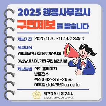대전 동구의회는 내달 3~14일까지 12일간 2025년도 행정사무감사와 관련한 구민 제보를 받는다고 30일 밝혔다.이번 제보는 행정의 위법·부당한 사항, 주요 시책 및 사업 개선·건의 사항, 예산 낭비 사례, 구민 생활 불편 등 다양한 내용을 대상으로 한다.제보는 △의