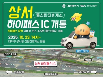 대전시는 오는 23일 오후 2시부터 경부고속도로 서울방향 신탄진휴게소 내 ‘상서 하이패스 나들목(IC)’을 개통한다고 21일 밝혔다. 이번 개통으로 북부권 주민들의 고속도로 진출입이 빨라지고, 신탄진IC 교통 분산과 물류 효율성 향상이 기대된다.상서 하이패스I