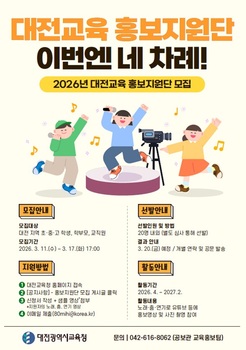 대전시교육청이 학생·학부모·교직원이 직접 참여해 대전교육을 알리는 ‘2026년 대전교육 홍보지원단’을 공개 모집한다.11일 대전시교육청은 오는 17일까지 교육가족 참여형 홍보 콘텐츠 제작을 위한 ‘2026년 대전교육 홍보지원단’ 지원서를 접수한다고 밝혔다.홍보지원단은