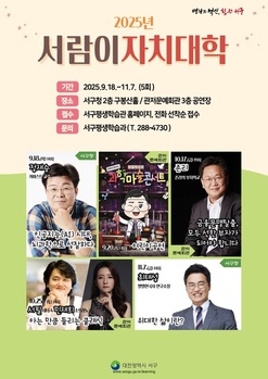 대전 서구는 9월 18일 정재승 KAIST 교수의 ‘인공지능 시대, 뇌과학으로 성찰하다’를 시작으로 ‘2025년 하반기 서람이 자치대학’을 운영한다고 11일 밝혔다. 이번 운영은 22회째로 다채로운 강연과 공연으로 구민들의 평생학습 욕구를 채워주기 위해 마련됐