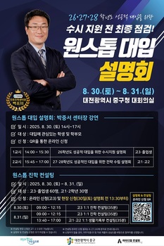 대전 중구는 오는 30~31일 양일간 수험생과 학부모를 대상으로 ‘2026 대학입시 전략 설명회’와 ‘1대1 진학 컨설팅’을 무료로 진행한다고 6일 밝혔다.컨설팅은 이투스 박중서 진로진학센터장이 △수시지원 전 최종 점검 △2027·2028학년도 대비 전략을 주제로 오후