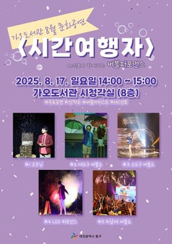 대전 동구는 여름방학을 맞아 오는 17일 오후 2시 가오도서관 시청각실에서 어린이와 주민을 위한 버블퍼포먼스 ‘시간여행자’를 개최한다고 7일 밝혔다.이번 공연은 △오프닝 쇼 △소도구·대도구 버블쇼 △LED 퍼포먼스 △피날레 등으로 구성됐으며, 100여 명의 관람객에게