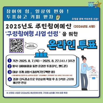 대전 유성구는 오는 7~27일까지 주민이 직접 제안하고 선택하는 ‘구정참여형 사업’ 선정을 위해 온라인 투표를 진행한다고 5일 밝혔다.이번 투표는 주민참여예산 구민위원회가 심의한 총 11개 사업(6억 6,700만 원 규모)을 대상으로 하며, 득표순으로 약 5억 원 예산