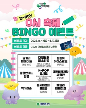 대전시는 오는 8~16일까지 열리는 ‘2025 대전 0시 축제’ 기간, 현장 방문객 대상 SNS 이벤트 ‘프로그램 BINGO 완성하기’를 진행한다고 4일 밝혔다.이번 이벤트는 △길거리 퍼레이드 △대전보러 페스티벌 △꿈돌이 아이스호텔 △K-POP콘서트 △대전미래과학체험관