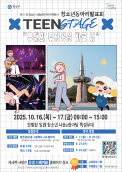 대전 유성구는 오는 22일까지 청소년 동아리 발표회 ‘2025 틴 스테이지’ 참가팀을 모집한다고 4일 밝혔다.이번 발표회는 대전시교육청 행복 이음 교육지구 사업의 하나로, ‘제11회 청소년 나 Be 한마당’과 연계해 10월 16~17일 열린다.모집 대상은 대전 내 중·