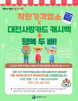 대전 서구가 착한가격업소 이용 시 대전사랑카드 적립 혜택을 강화한다고 밝혔다.14일 서구는, 오는 15일부터 관내 착한가격업소 중 대전사랑카드 가맹점에서 결제하면 기본 적립금 외에 3% 추가 적립금을 지급한다이번 조치는 저렴한 가격과 품질 좋은 서비스를 제공하는 착한가