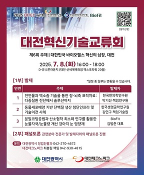대전시는 오는 8일 대전신세계 엑스포타워 20층 D-유니콘라운지에서 ‘제6회 대전혁신기술교류회(DITEC)’를 연다고 3일 밝혔다.이번 교류회는 ‘대한민국 바이오헬스 혁신의 심장, 대전’을 주제로 마련됐다. 특히 출연연과 바이오산업 관계자들이 참여해 기술성과와