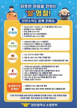 설 명절을 앞두고 대전소방이 다중이용시설과 전통시장 등 화재취약시설에 대한 집중 점검과 예방 활동에 나선다. 이번 활동은 최근 5년간 설 연휴 화재로 7명의 인명피해와 8억 4000만 원의 재산피해가 발생한 데 따른 선제 대응이다.18일 대전소방본부는 19일~