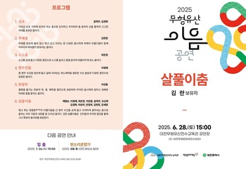 대전문화재단 대전무형유산전수교육관이 오는 28일 오후 3시 ‘2025 무형유산 이음공연’ 세 번째 무대로 살풀이춤 공연을 펼친다고 밝혔다.액운을 푸는 전통춤인 살풀이춤과 소고춤, 쌍수건춤을 김란 보유자와 이수자 11명이 선보인다.23일 교육관에 따르면 오는 28일 오후