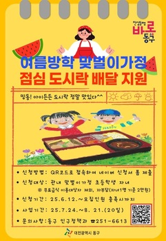 대전 동구는 오는 12일부터 여름방학 중 맞벌이 가정 초등학생을 위한 도시락 지원사업 ‘띵동! 아이든든 도시락’ 신청을 받는다고 밝혔다.이번 사업은 방학 중 돌봄 공백 해소와 성장기 아동의 균형 잡힌 식사 제공을 위한 동구형 인구정책으로, 가오동 소재 ‘새터말협동조합’
