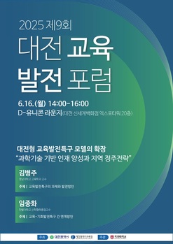 대전시는 교육과 산업의 연계를 강화하고 과학기술 기반 지역 인재를 키우기 위한 전략 논의에 나선다고 밝혔다.11일 대전시는 시 교육청과 공동으로 오는 16일 오후 2시 엑스포타워 20층 D-유니콘라운지에서 ‘제9회 대전교육발전포럼’을 개최한다.이번 포럼은 ‘대전형 교육