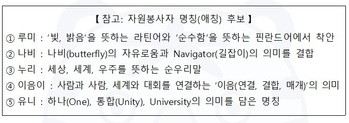 2027 충청 유니버시아드대회 조직위원회(위원장 강창희)는 대회 자원봉사자 명칭 선호도 조사를 10일부터 19일까지 진행한다고 9일 밝혔다.이번 조사는 자원봉사자의 의미를 널리 알리고 참여 의욕과 소속감을 높이기 위해 마련됐다. 조직위는 전문가 검토를 거쳐 △