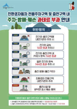 세종시(시장 최민호)는 오는 5일부터 환경친화적 자동차 주차 위반과 충전방해행위에 대한 주민신고제 운영기준을 강화한다고 1일 밝혔다.이번 조치는 개정된 ‘환경친화적 자동차의 요건 등에 관한 규정’을 반영해 충전시설 장시간 점유를 막고 전기차 이용자의 충전 편의를 높이기