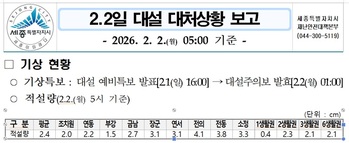 세종시 전역에 대설주의보가 발효된 가운데 시가 사전 대응과 신속한 제설 작업으로 현재까지 별다른 피해 없이 상황을 관리하고 있다.기상청에 따르면 2일 오전 1시 대설주의보가 발효됐으며, 같은 날 오전 5시 기준 세종시 평균 적설량은 2.4cm를 기록했다. 전동면(4.1