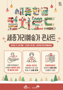 세종시문화관광재단(대표 박영국)은 오는 29일 오전 11시 조치원읍 1927아트센터에서 ‘세종거리예술가 콘서트’를 연다고 25일 밝혔다.‘2025 찾아가는 세종한글컬처로드’의 일환으로 마련된 이번 공연에는 올 한 해 세종 전역에서 활동한 거리예술가 24팀이 참여해 릴레