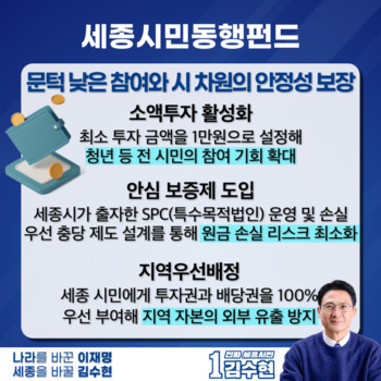 더불어민주당 김수현 세종시장 예비후보가 ‘경청으로 해결한다’ 시리즈 2탄으로 ‘세종시민동행펀드’ 조성 공약을 24일 발표했다.이번 공약은 시민이 단순한 행정 수혜자를 넘어 도시 성장의 투자자로 참여하고, 그 성과를 함께 나누는 구조를 만들겠다는 것이 핵심이다.김 후보는