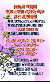 세종시가 다른 지자체보다 지나치게 적은 보통교부세를 배분받고 있다는 지적이 이어지는 가운데, 세종지역 시민들이 정부에 정상화를 요구하며 결의대회를 연다.세종사랑시민연합은 오는 25일 오전 11시 행정안전부 서문 공터(세종시 도움6로 42)에서 '세종시 역차별 보통교부세