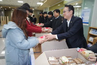 충북 서원대학교 손석민 총장과 보직 교수, 총학생회 간부들이 2학기 기말고사 기간을 맞아 공부에 열중하고 있는 학생들에게 사랑의 아침간식나누기 행사를 가졌다. 12일부터 시작된 기말고사 기간 중에 학생들이 아침을 든든하게 먹고 시험을 잘 치뤄 좋은 학점을 받고록 격려하