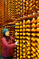 충북 영동군 양강면의 한 곶감 농가에서 감 타래에 걸려 있는 주황색 일색인 곶감들이 겨울철 별미의 자태를 뽐내고 있다. 달달하고 쫀득한 곶감은 속담에 ‘돌팔이 의원이 감 보고 얼굴 찡그린다’ 고 할 만큼 한방에서 동맥경화와 고혈압, 만성기관지, 감기, 설사에 효능이 있