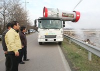 이승훈 충북 청주시장이 22일 옥산면 미호천 철새도래지 방역현장을 방문해 조류인플루엔자(AI)의 철저한 방역을 주문했다.이 시장은 방역 현장에서 오창농협 관계자들에게 “추운날씨에도 AI 차단방역에 힘써줘 감사하다”며 “더이상 AI가 확산되지 않도록 방역취약지역 소독에