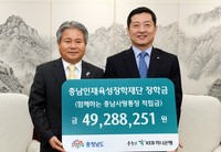 KEB하나은행 충청영업그룹이 충남도에 장학금 4900만원을 전달했다.오상영 충청영업그룹 대표는 17일 충남도를 방문, 허승욱 정무부지사와 김명숙 (재)충청남도인재육성재단(이사장 안희정) 상임이사에게 지역인재육성을 위해 장학기금 4928만8251원을 기탁했다.이 장학기금