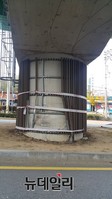 충북 청주시 서원구 충북대병원 앞 과선교 교각을 보호하기 위해 설치한 시설물이 파손된 채 수개월째 방치돼 있다. 이 시설물은 청주시가 과선교를 준공한 뒤 교각보호를 위해 설치했지만, 대형 차량들에 의해 파손된 채 임시로 공사용 테이프를 둘러 쳐저 있어 미관을 해치고 있