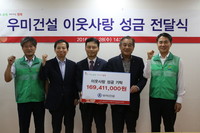 우미건설이 청주지역 사회복지시설 등에 써달라며 통 큰 기부를 해 눈길을 끈다.우미건설(주)(대표 이석준)는 28일 충북모금회(회장 이명식)를 찾아 이웃사랑 성금 1억6900만원을 전달했다.이날 전달식에는 우미건설 최요한 상무와 충북공동모금회 이명식 회장, 새마을회 박연