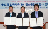 충남도가 다음달 7일 막을 올리는 제97회 전국체육대회를 ‘탄소중립형 행사’로 치르기 위해 한국에너지공단, 한국중부발전과 손을 맞잡았다.도는 19일 도청 접견실에서 허승욱 부지사, 이광학 에너지공단 기후대응이사, 이덕섭 중부발전 발전처장 등이 참가한 가운데 ‘탄소중립형