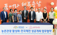 충남도가 세계 최대 공유숙박 사이트인 에어비앤비와 올해 도내에서 열리는 전국체전의 성공 개최와 농촌관광 및 농가민박 활성화를 위해 힘을 모은다.도는 5일 도청에서 에어비앤비와 ‘성공적인 전국체전 개최 및 농촌관광 활성화를 위한 업무협약(MOU)’을 체결했다고 밝혔다.이