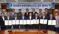 ‘2016 청주세계무예마스터십’ 조직위원회가 29일 (사)한국농업경영인중앙연합회 등 농림축산분야 6개 단체와 대회 홍보 및 관람객 유치를 위한 업무협약을 맺었다.이날 협약을 맺은 단체는 한국농업경영인중앙연합회를 비롯해 (사)한국쌀전업농중앙연합회, (사)전국친환경농업인연