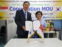 충북 진천의 한국바이오마이스터고등학교(교장 고종현)가 글로벌 현장실습을 위해 싱가포르 현지 산업체와 MOU를 맺었다. 현장학습팀은 지난 18일 바이오식품과 학생들을 위해 FU ZHONG HUA와 MOU 협약식을, 20일에는 바이오제약과 학생들이 현장실습을 진행하게 될