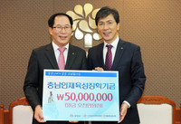 NH농협은행 충남영업본부가 27일 27일 도청 접견실에서 충남인재육성재단(이사장 안희정)에 충남 미래인재 육성을 위한 장학기금 5000만원을 전달했다.도 출연기관인 충남인재육성재단은 장학사업, 충남대전학생기숙사를 운영하고 있으며 현재 서울지역에 재학 중인 충남 출신 학