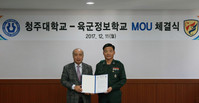 정성봉 청주대학교 총장과 김진수 육군정보학교장이 학⋅군 제휴 학술교류 협약을 가진 후 기념촬영을 하고 있다.청주대학교와 육군정보학교(학교장 준장 김진수)가 미래 드론 전력발전을 위한 전문기술 인재육성과 상호교류를 통한 양 기관의 상생발전을 도모키로 했다.12일 청주대