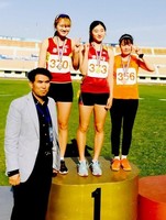 여자 800m 경기 후 김선이(좌측, 만 21세)선수, 김지원(중앙,만 19세)선수가 단상에 올라 기념촬영을 하고 있다. 충북대학교 육상부가 지난 4~8일 경북 김천종합운동장에서 개최된‘제46회 전국 종별 육상경기 선수권 대회’에서 금메달 2개, 은메달 2개, 동메달