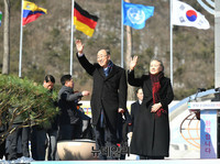 반기문 전 유엔사무총장과 부인인 유순택 여사가 14일 오후 충북 음성군 맹동면에 위치한 사회복지시설 꽃동네를 방문해 어린이들에게 축하 꽃다발을 받고 있다. (충북 음성=뉴데일리 정상윤 기자)