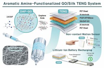 한국기술교육대학교(총장 유길상) 화학생명공학전공 배진우 교수 연구팀이 실크 소재와 기능성 나노소재를 결합해 스스로 전기를 생산하는 마찰전기 나노발전기(TENG)와 무전원 센서 기술을 선보였다.최근 사물인터넷(IoT) 센서 보급이 확대되면서 외부 전력 공급 없이도 작동할