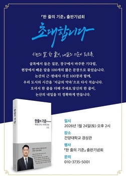 논산시의회 서원 의원은 오는 24일 오후 2시 건양대학교 경상관에서 저서 '한 줄의 기준' 출판기념회를 연다고 16일 밝혔다.이번 출판기념회는 서원 의원이 현장에서 마주한 질문과 고민, 그리고 지역과 시민을 향한 성찰을 짧은 문장으로 풀어낸 책 '한 줄의 기준'의 출간