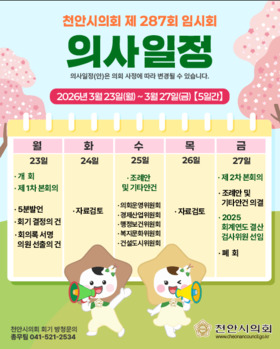 천안시의회가 오는 23일부터 27일까지 5일간의 일정으로 제287회 임시회를 운영한다.이번 임시회에서는 시정 주요 현안과 시민 생활에 밀접한 조례안 등 총 43건의 안건이 심의될 예정이다.회기 첫날인 23일 열리는 제1차 본회의에서는 5분 발언을 통해 다양한 정책 대안