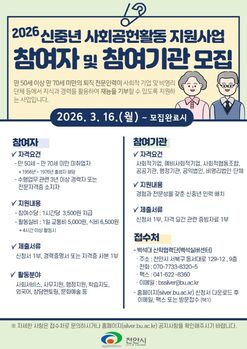 천안시가 퇴직 전문인력의 풍부한 경험을 지역사회 공헌 활동으로 연결하는 ‘2026 신중년 사회공헌활동 지원사업’을 추진한다.천안시는 신중년 세대의 전문성을 비영리기관의 공익사업과 연계해 교육과 행정지원 등 다양한 사회서비스를 제공하는 지원사업을 본격 시행한다고 13일
