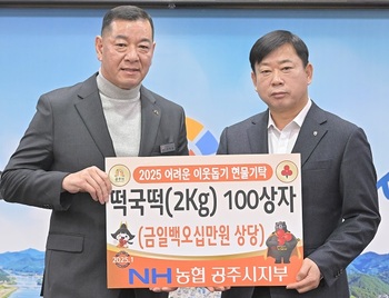 NH농협 공주시지부(지부장 황광환)는 20일 공주시청을 방문해 설맞이 떡국떡 100박스(200kg)를 전달하며 나눔행사를 진행했다고 밝혔다. 이번 행사는 지역사회 취약계층 가정에 설 명절을 맞아 도움을 주기 위해 마련됐다. 후원품은 공주시를 통해 독거