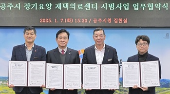 충남 공주시는 지난 7일 시청 집현실에서 장기요양 재택의료센터 시범사업을 위한 업무 협약식을 체결하며 본격적인 사업 운영에 나섰다.8일 시에 따르면 협약식에는 보건복지부가 주관하는 장기요양 재택의료센터 시범사업에 참여할 의료기관으로 선정된 공주시, 공주의료원, 대산한의
