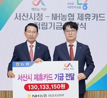충남 서산시는 지난 9일 시청 시장실에서 NH농협은행 서산시지부 제휴카드 적립기금 전달식을 했다고 밝혔다.이날 전달식에는 이완섭 서산시장과 윤희철 NH농협은행 서산시지부장 등이 참석했다.NH농협은행 서산시지부는 서산시에 1억 3013여만 원의 적립기금을 전달했다.이 기